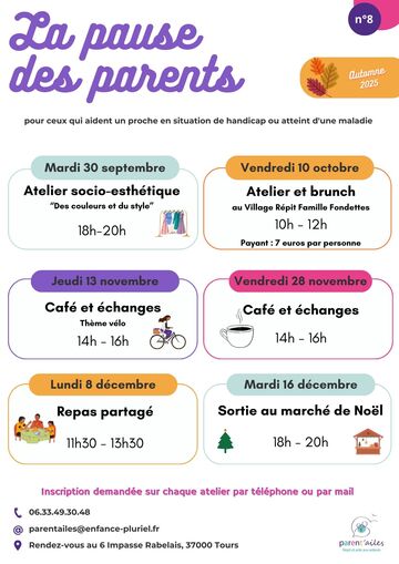 Le programme des rencontres entre parents proposées par la Plateforme de répit Parent'ailes pour le dernier trimestre 2025.